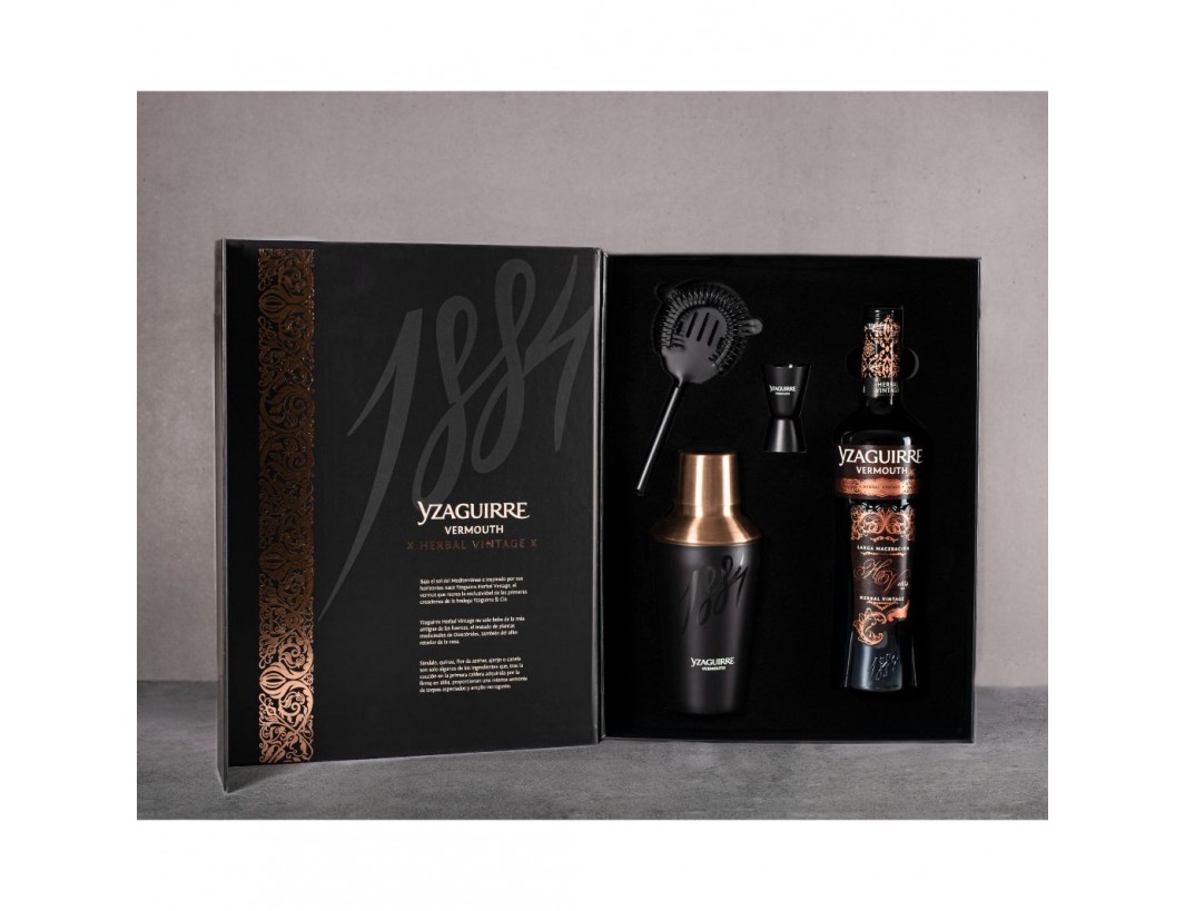 Includes: A shaker, a strainer, a measurer and a bottle of Yzaguirre Herbal Vintage Vermouth.