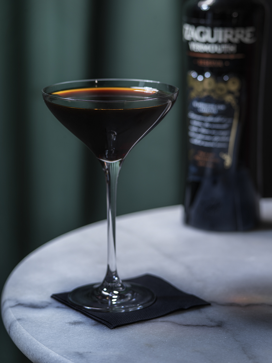 En un vaso mezclador, introduce una hierba de estragón y presiónala ligeramente para aromatizar. Llena el vaso mezclador con hielo y sirve una medida de Vermouth Yzaguirre Rojo Reserva, una medida de un buen licor de chocolate negro y, por último, una medida del whisky escocés Glenfiddich 18 Single Malt. Remueve durante unos 20 segundos y cuela en una copa coupe bien fría. Decora con una rama de estragón.