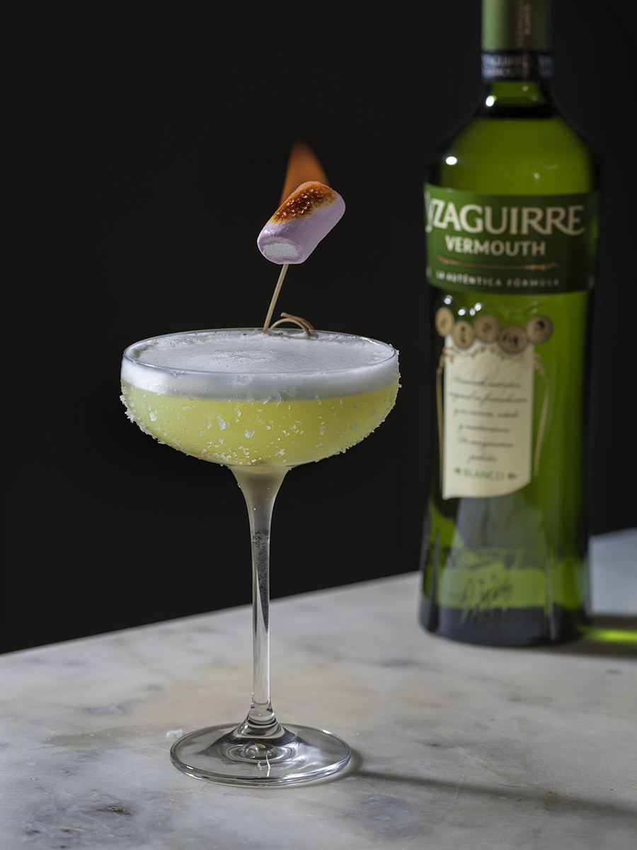 En una coctelera mezcla 4cl Vermouth Yzaguirre Blanco, 3cl Pisco, 2cl de la clara de un huevo, 3cl de zumo de limón y por último 2cl de nuestro sirope de ají amarillo. Agitamos primero sin hielo para que emulsione todo bien y se integren los ingredientes. Preparamos la copa pasando un gajo de lima por toda ella y espolvoreando sal maldon un poco triturada. Ahora añadimos hielo a la coctelera, agitamos y colamos en nuestra preparada copa coupé.